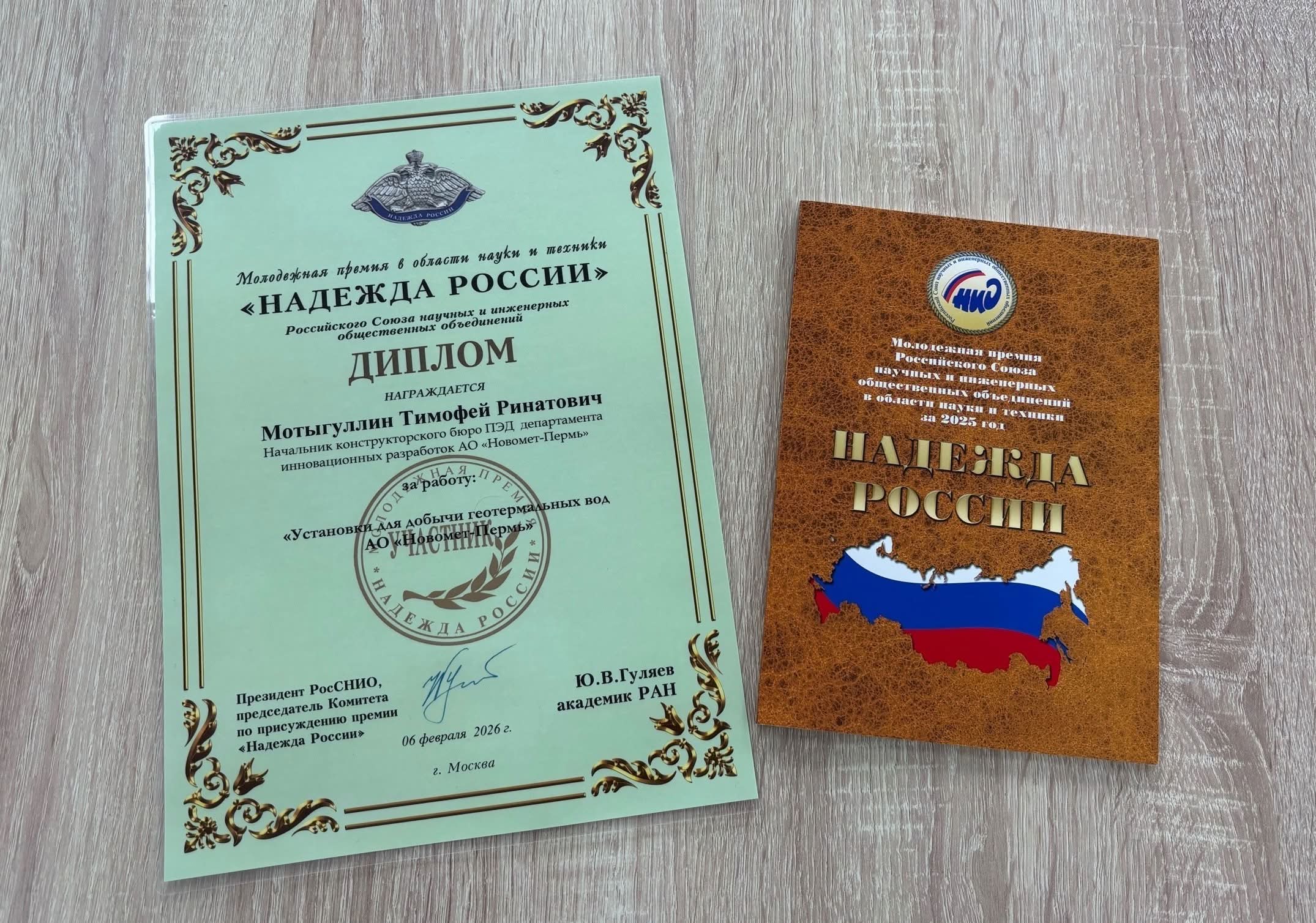 Российский Союз научных и инженерных общественных объединений подвел итоги ежегодной молодежной премии «Надежда России» в области науки и техники за 2025 год. Этот конкурс внесен в перечень наиболее престижных наград и является высшим признанием со стороны научно-технической общественности страны достижений молодых ученых и специалистов в развитии научно-технического прогресса в своей области профессиональной деятельности.